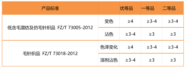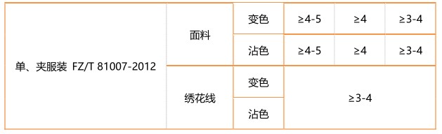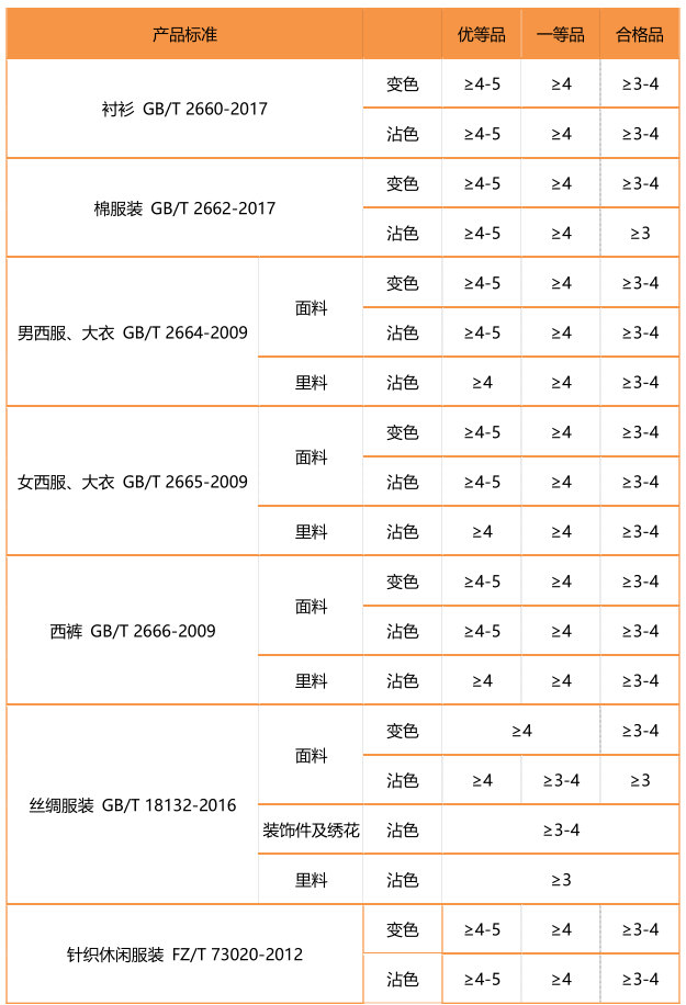 不同的產(chǎn)品對于耐干洗色牢度的要求也有所不同。小編為大家列舉了一些常用的服裝對耐干洗色牢度的考核等級。