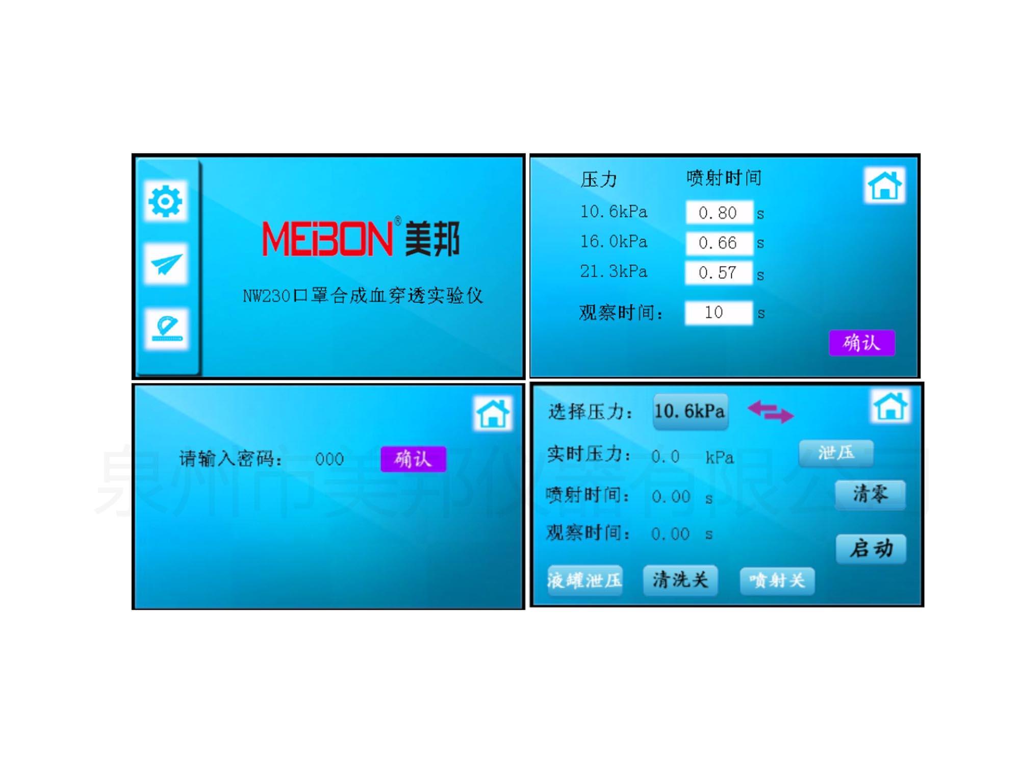 4、可直接選定模擬人體的平均血壓10.6kPa、10.7kPa、16kPa、21.3kPa所對應(yīng)的噴射速度來進(jìn)行試驗,無需人工調(diào)節(jié),測試便捷。