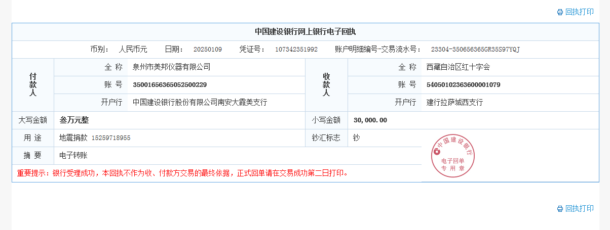 全球性經(jīng)濟(jì)寒冬,大家生活、發(fā)展都不易!西藏日喀則地區(qū)發(fā)生地震讓當(dāng)?shù)厝藗兏茄┥霞铀?!美邦儀器牢記使命,不忘初心!捐款3萬(wàn)元略表心意!祝災(zāi)區(qū)人民早日恢復(fù)正常生活!